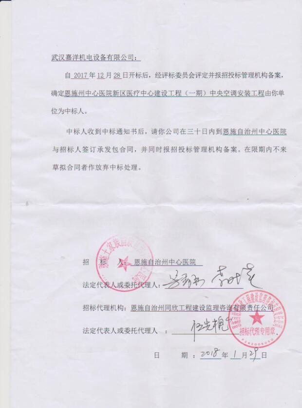 2018年1月29日武漢嘉洋機電設備有限公司在“恩施州中心醫(yī)院新區(qū)醫(yī)療中心建設工程(一期)中央空調(diào)工程”項目中中標,在此向參與此次投標的同志們表示熱烈祝賀,同時期望武漢嘉洋機電銷售成員再接再勵,再創(chuàng)業(yè)績。