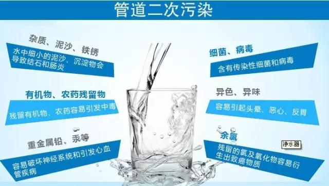 自來(lái)水幾十年來(lái)一直是城鎮(zhèn)居民的主要飲水來(lái)源,但由于今年來(lái)各地的水源受到不同程度的污染,加上城市的供水管道老化,增加了自來(lái)水二次污染的幾率;此外,自來(lái)水在消毒時(shí),使用了大量的氯氣和含氯漂白粉,他們?cè)贇⒕耐瑫r(shí)也帶來(lái)了游離氯對(duì)各種有機(jī)物的氯化作用,其中包含致癌的含氯二噁英。這些有毒含氯物質(zhì)即使在高溫下也不易分解,嚴(yán)重危害著人類(lèi)的健康。